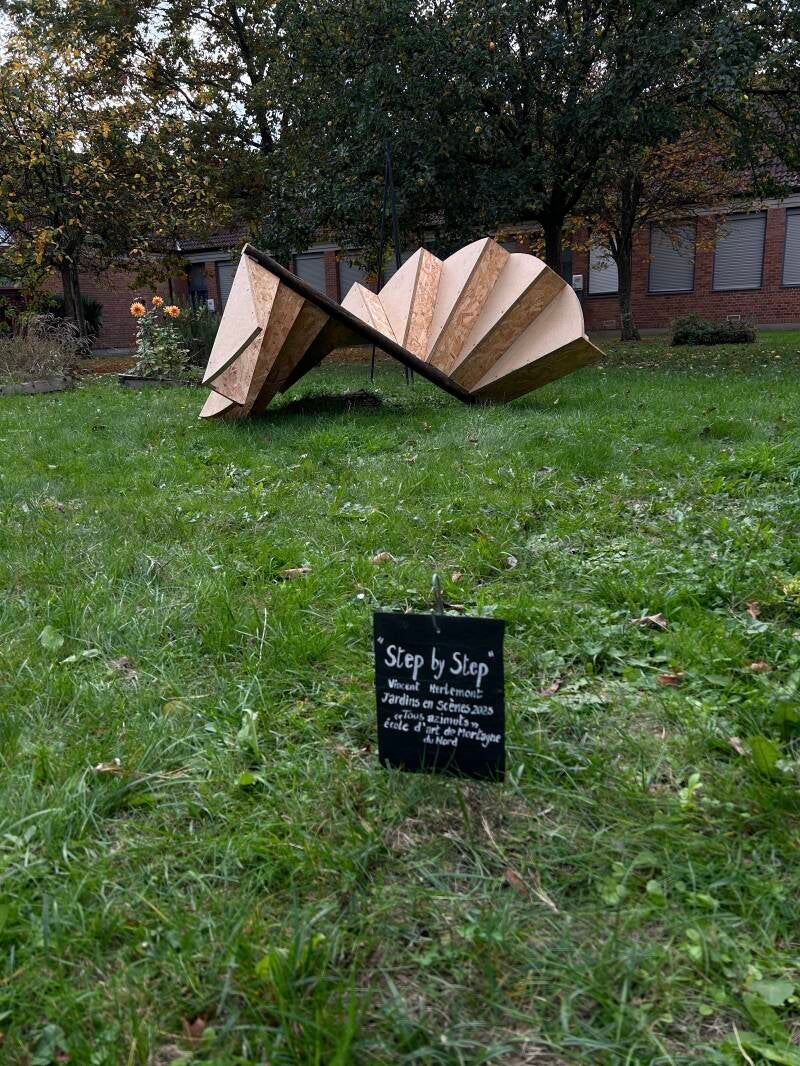 Sclupture "Step By step" de Vincent Herlemont transférée au collège fernig, à Mortagne dans le cadre de Jardins en scènes 2025