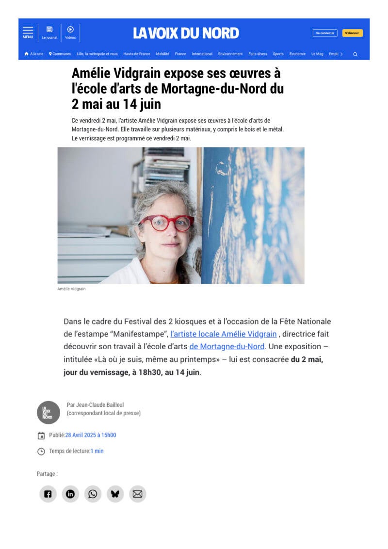 Presse exposition "Là où je suis, même au printemps" d'Amélie Vidgrain dans le cadre de "Manifestampe 2025" et du festival des "2 kiosques", soutenu Par la Région Hauts de France. mai 2025