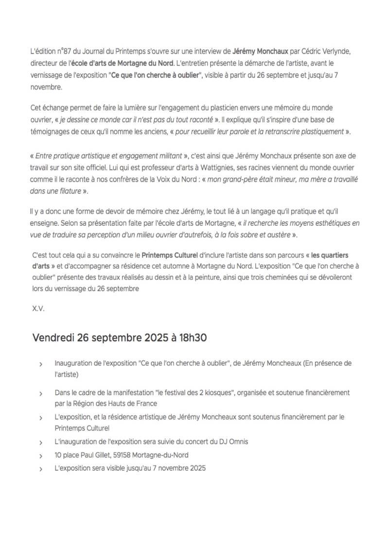 Entretien dans le journal du printemps culture autour de l'exposition et de la résidence artistique de Jérémy Moncheaux
