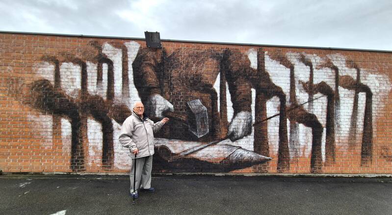 Fresque réalisée par Jérémy Moncheaux, dans le cadre de sa résidence artistique sur le territoire amandinois, sur le mur de l'école des 2 vallées (entrée côté maternelle). La fresque est un hommage à Michel Loin, présent sur la première photo, rentré comme forgeron à l'âge de 14 ans dans l'usine de zinc de Mortagne-du-Nord