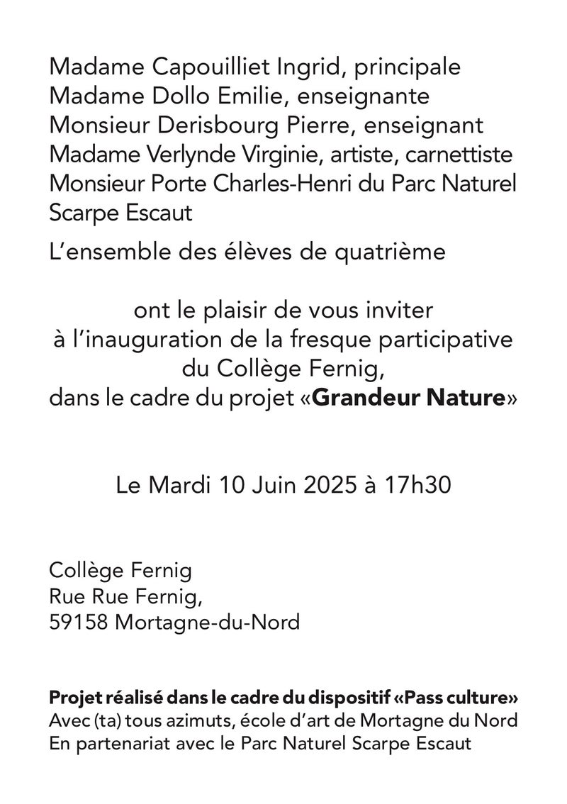 Dans le cadre d'un projet soutenu par par Pass Culture et "Adage" avec Virginie Verlynde, artiste associée. En partenariat avec le Parc Naturel Régional Scarpe-Escaut. Inauguration le mardi 10 juin à 17h30.